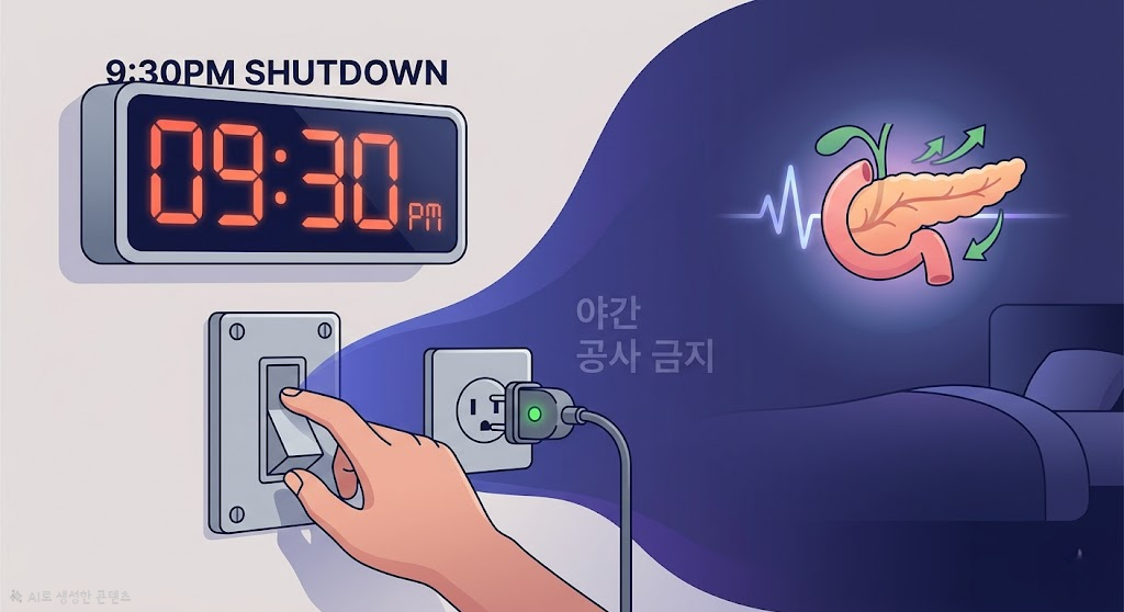 - 원칙 2: 9:30 PM 디지털 및 위장 셧다운 야식은 잠든 췌장을 깨워 강제 야간 근무를 시키는 행위입니다. 저녁은 6시 이전에 끝내고, 밤새 췌장이 스스로를 보수할 수 있도록 '야간 공사 금지'를 철저히 지켜야 합니다.