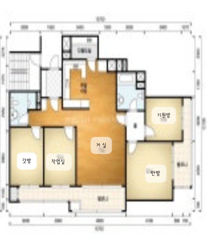 우리 집의 구조는 현관에서 들어오면 벽을 마주하는데 벽에는 그림이 걸려있고 왼쪽에는 갓방과 화장실, 오른쪽에는 꿈꾸는 희망방(작업방)이 있고 또 살짝 더 들어가면 집의 중심인 거실이 나온다. 거실에서 안쪽(남향)으로 바로 들어가면 기원 방이 있고 왼쪽에는