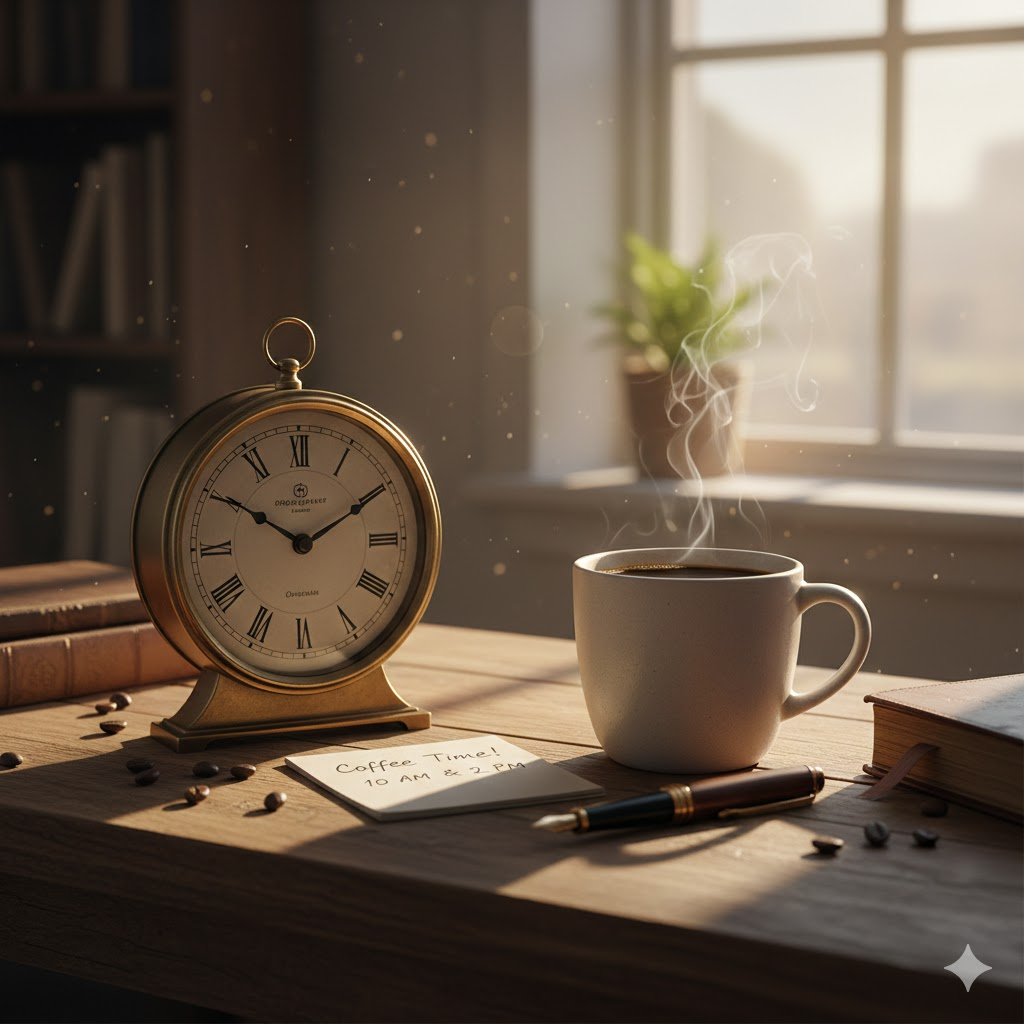 (1) 코르티솔 리듬을 활용한 골든 타임 : 우리 몸은 기상 직후 천연 각성 호르몬인 '코르티솔'을 분비합니다. 이때 커피를 마시면 몸의 자연스러운 각성 시스템이 망가져 오히려 더 큰 피로를 느끼게 됩니다. 따라서 기상 후 1~2시간 뒤인 오전 10시경, 혹은 코르티솔 수치가 낮아지는 오후 1시~3시 사이에 마시는 것이 가장 효율적입니다.