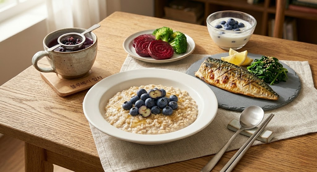 | 아침 | 따뜻한 오트밀 + 블루베리 한 줌 | 혈당 안정 및 뇌 깨우기 |