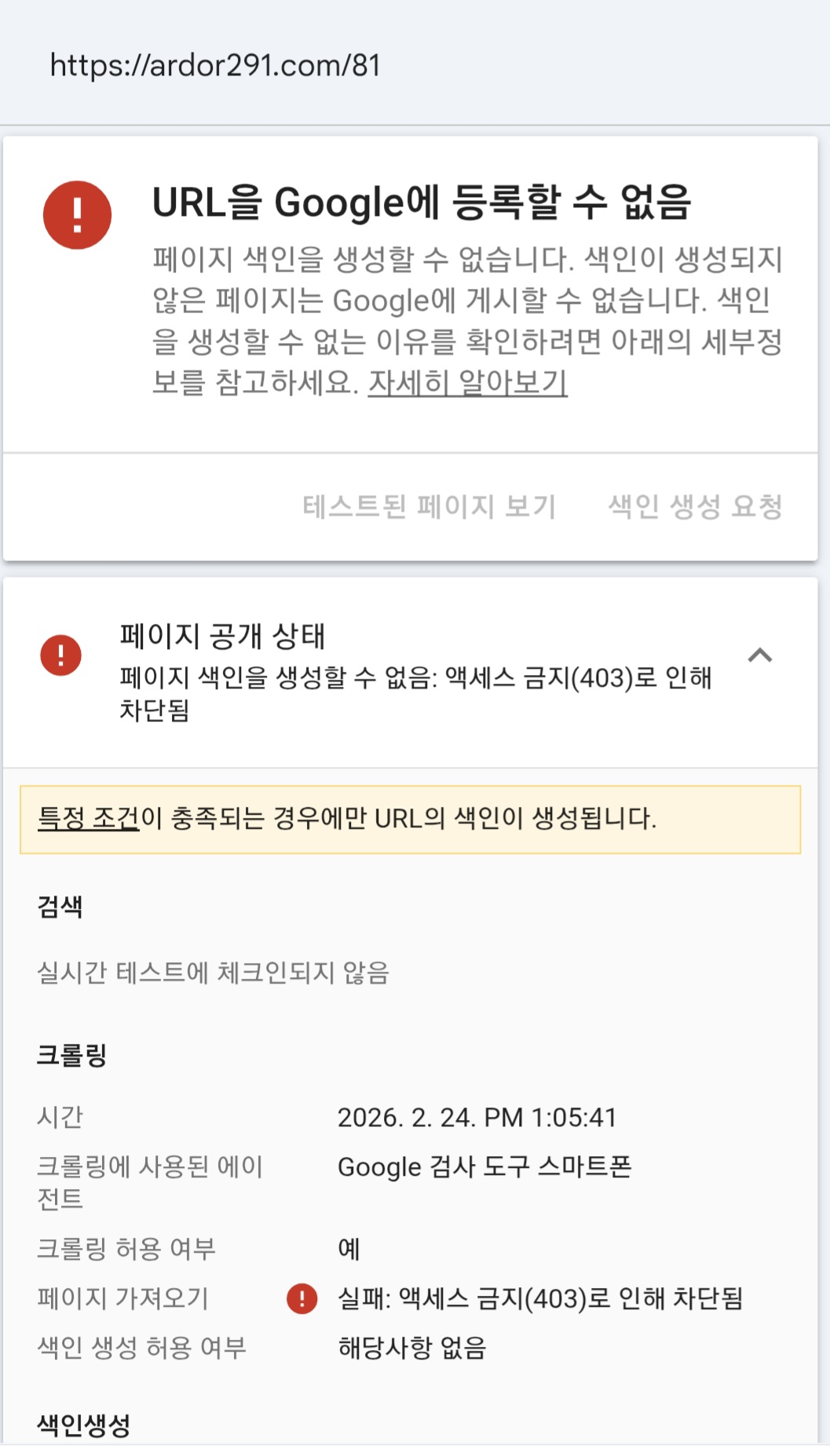제가 겪은 상황은 매우 흥미로웠습니다. 방금 발행한 81번 글은 계속해서 403 에러를 뱉어내며 색인 생성을 거부당했는데, 바로 이어서 테스트해 본 82번 글은 아무런 문제 없이 'URL을 Google에 등록할 수 있음'이라는 초록색 메시지가 뜬 것입니다.