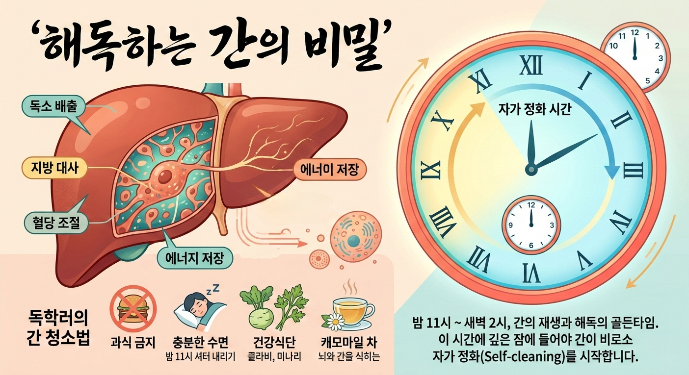 ​밤 11시, 뇌와 간의 셔터를 내리세요: 간이 가장 활발하게 재생되는 시간은 밤 11시부터 새벽 2시 사이입니다. 제가 최근 주문한 캐모마일 차는 단순히 잠만 잘 오게 하는 게 아니라, 뇌를 진정시켜 간이 온전히 해독에 집중할 수 있는 환경을 만들어줍니다.