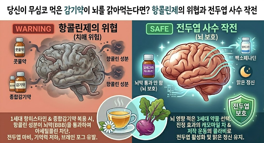 - 장기적 재앙: 최근 하버드 의대를 비롯한 세계적인 연구 기관들은 항콜린성 약물을 장기 복용한 집단에서 치매 발병률이 현저히 높다는 충격적인 결과를 발표했습니다. 당장의 콧물을 멈추려다 뇌의 핵심 기능을 저당 잡히는 셈입니다.