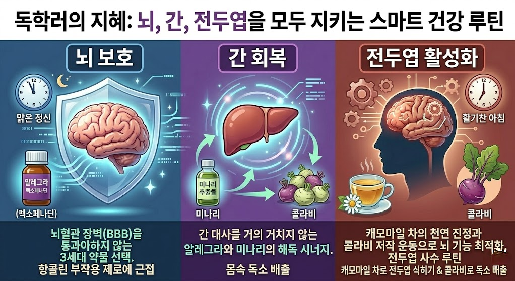 저는 오늘 밤, 알레그라 한 알과 향긋한 캐모마일 차 한 잔으로 가려움은 잠재우고 뇌의 명료함은 깨우려 합니다. 여러분도 전두엽을 사수하는 스마트한 건강 독학러가 되시길 진심으로 응원합니다.
